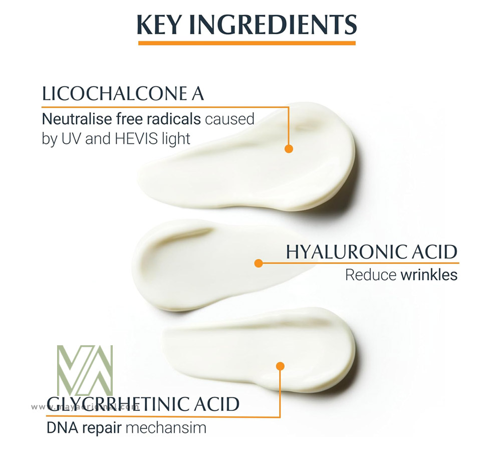 ترکیبات منحصربهفرد این ضدآفتاب، مانند هیالورونیک اسید و لیكوچالكون A، نقش کلیدی در حفظ رطوبت، بهبود انعطافپذیری پوست و خنثیسازی اثر رادیکالهای آزاد دارند. بنابراین این ضدآفتاب نهتنها از پوست در برابر آسیبهای محیطی محافظت میکند، بلکه بهطور فعال با علائم پیری مانند چینوچروک، خشکی و لکههای تیره مقابله میکند.