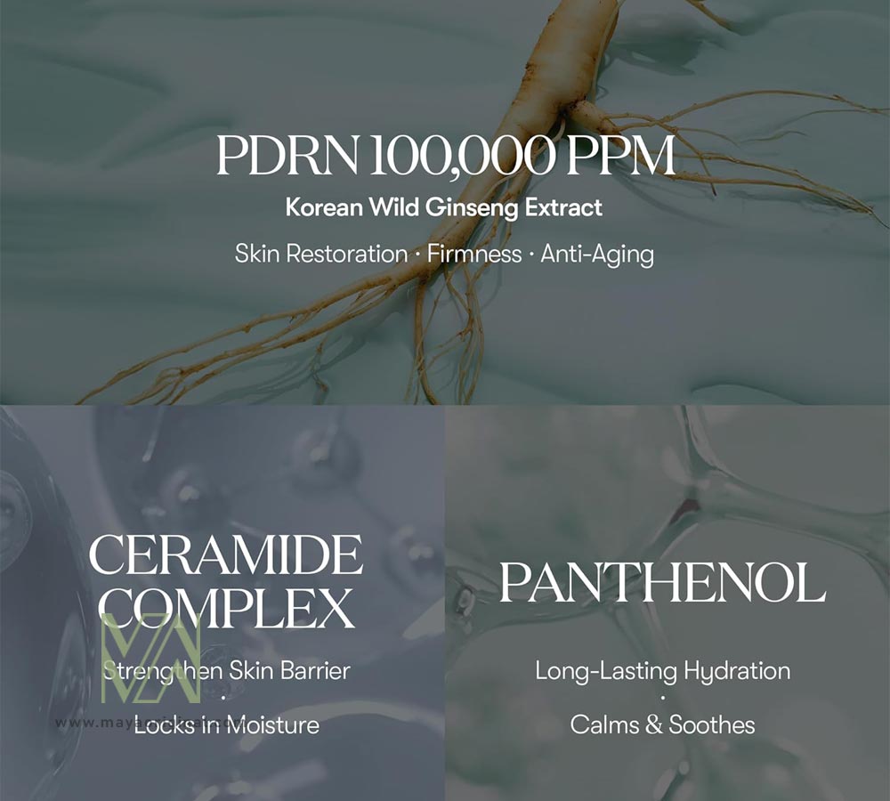 PDRN گیاهی (Phyto PDRN از جینسنگ وحشی)، سرامیدها، پلی‌گلوکورونیک اسید، پان‌تِنول، اسکوالان، آلانتوئین و ترکیبات مرطوب‌کننده و تقویتی
